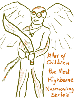 Incidentally, Killer of Children the most Highborne Narrowwing Skrie'e isn't a twinky name. They're all like that. Lower ranks tend to add name components like jewellery; only the top (i.e. really flippin' scary) celestials are known by just their names-in-wing.