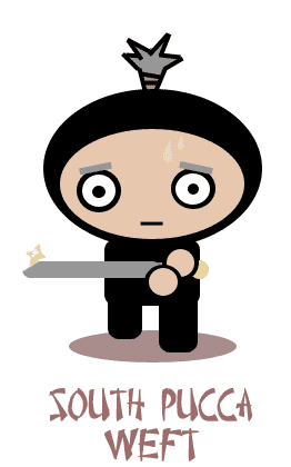 Weft drawn as a character from Pucca Funny Love (a webtoon series Julia likes), in its style mixed with a bit of South Park.